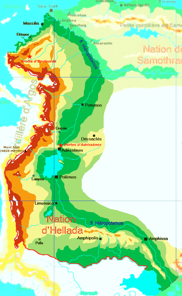 Hellada est une nation de forme longiligne. Elle suit le cours du Hiéropotamos depuis la cuvette de Kelos et la région des lacs autour de Anthopolis, en Aeton. Sur sa partie bâbord, Hellada est comprimée par la longue Cordillère d'Argos, chaîne de hautes montagnes, qui ont longtemps privé les hommes d'Hellada d'un accès sur l'Océan. Douze cités forment le découpage administratif historique. Parmi les plus peuplé, Adrissènes, Potamos et Amphissa possèdent plus de 5 millions d'habitants. Plus de 55% de la population vit à l'intérieur de ces villes. A l'extérieur de ces douze cités, la vie est rural, dominée par l'agriculture. Aujourd'hui, entre 40 et 45% de la population vit hors des villes. Massilia et Ektopos, à l'avant du pays, sont les deux seules cités situées sur la cote maritime. Cette caractéristique a fait de ces cités d'importants enjeux de luttes passées. Aujourd'hui, ces villes jouissent d'une grande importance dans les relations avec les nations de l'Océan Paradigmique tel que Ménéarq. Données :